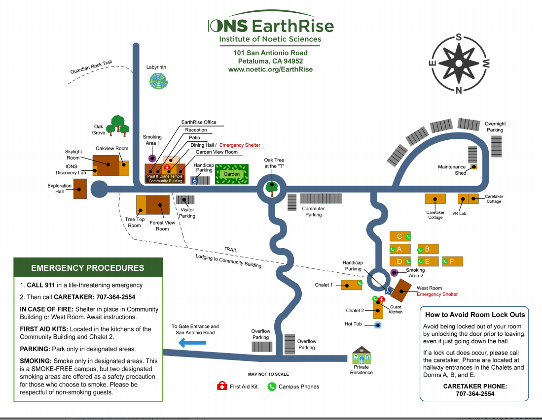 EarthRise at IONS accommodates 100+ overnight guests in eight buildings. All housing accommodations are situated near to one another, and are located next to the West Room and are a 0.25m walk from the dining hall and other meeting rooms on mostly flat, paved ground. The housing is described as modest and simple. Single and shared rooms are available; most rooms have two twin beds, some have one full/queen bed. The bathrooms in each building are located in the hallway and shared with other guests. Bedding, linens, and towels are provided.